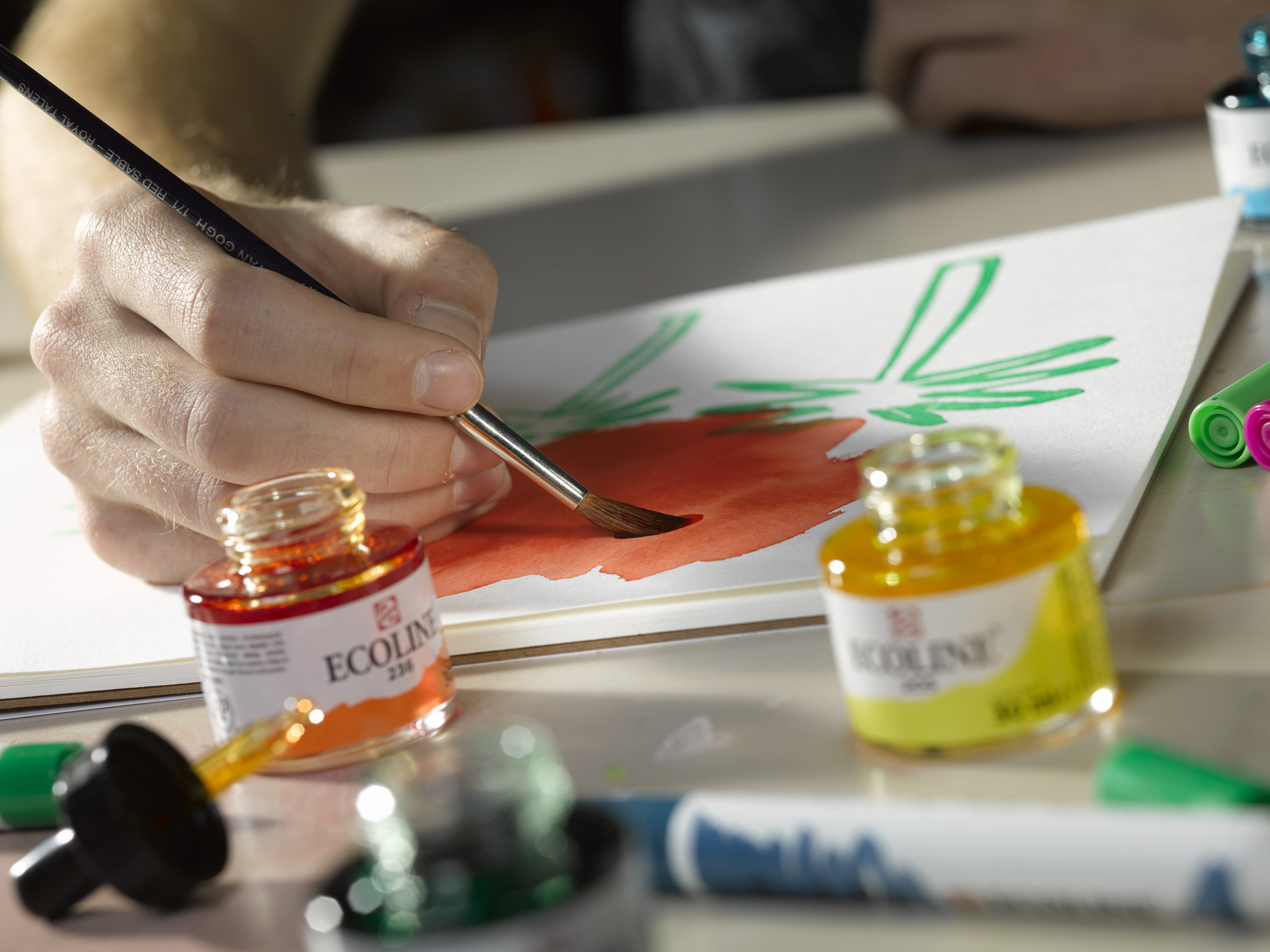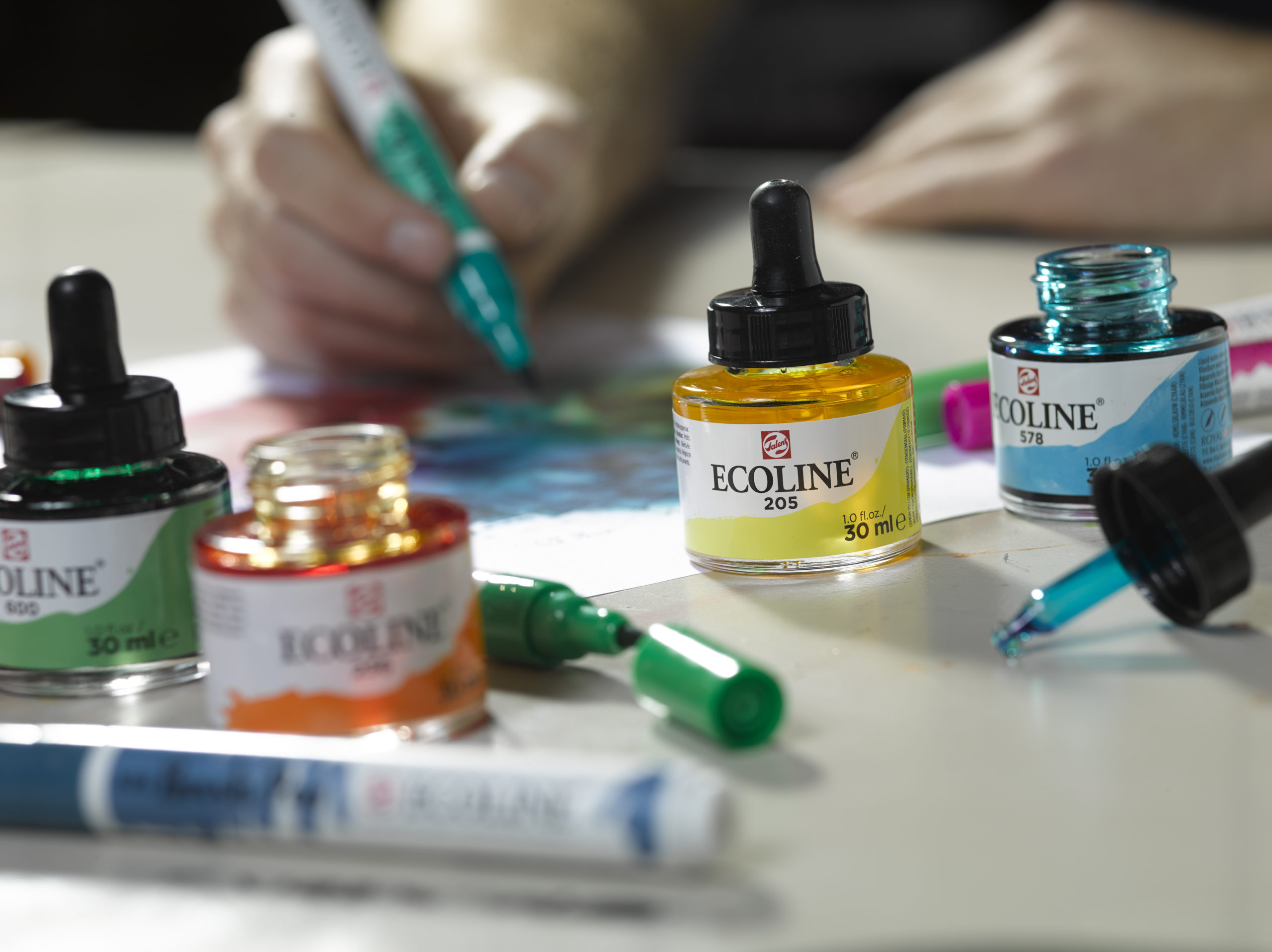 Talens Ecoline Acuarela Líquida Frasco 30 ml está hecho en base de colorantes y goma arábiga. El frasco lleva una práctica pipeta para dosificar la Ecoline al hacer mezclas. Los colores de Talens Ecoline son de una transparencia y lucidez impredecible. Para conservar bien los colores, se aconseja guardar las obras en una carpeta.