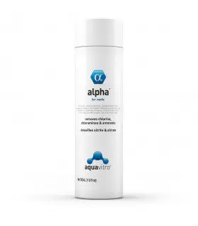 - ALPHA™ de Aquavitro® es un acondicionador concentrado para agua salada, que elimina el cloro, la cloramina y el amoniaco.