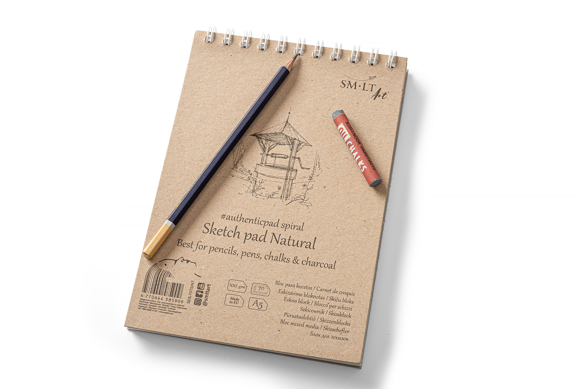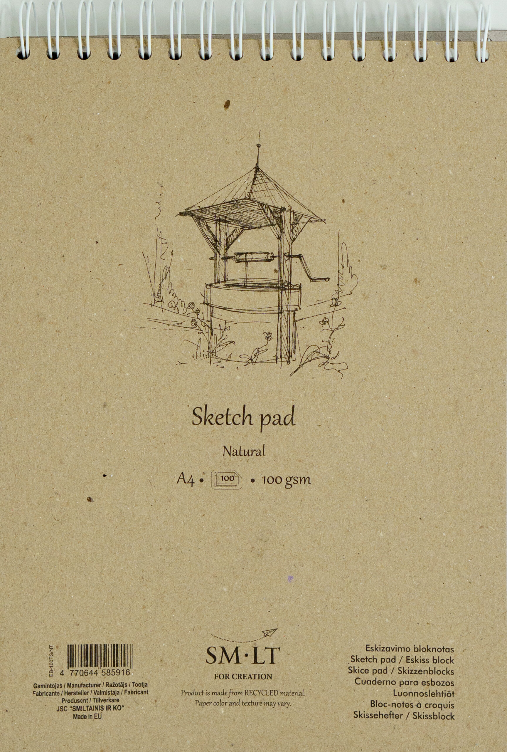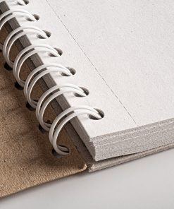 Con papel 100 % reciclado. El papel tiene un tono grisáceo y pequeños puntos irregulares. Ideal para lápices, bolígrafos, tizas y carboncillo. El papel interior cuenta con certificación FSC. Con cubierta de cartón de color natural, tapa dura, hojas microperforadas y espiral superior.