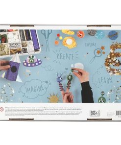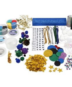Contenido: Foam Clay, Silk Clay, Sticky Base, papel brillante, papel iridiscente, pompones de purpurina, una variedad de lentejuelas, ojos ondulados autoadhesivos, cuentas acrílicas, cuerda de oro, figuras de espuma EVA con brillo, bolas de poliestireno, limpiadores de tuberías de metal, lametta de celofán iridiscente e hilo metálico con estrellas.