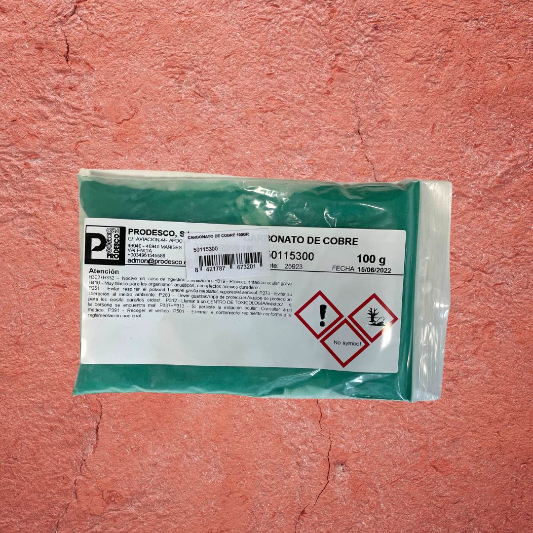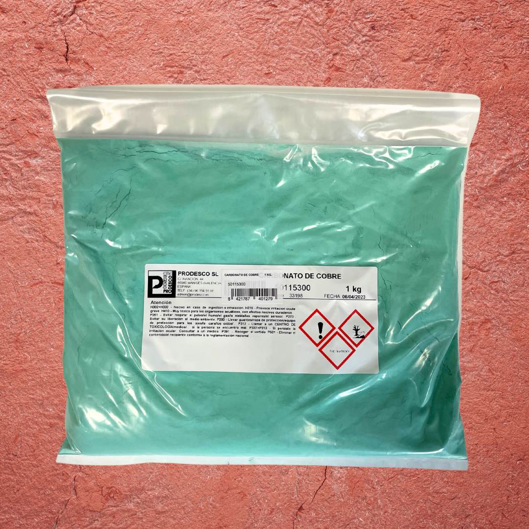 El carbonato de cobre es usado para añadir cobre en los esmaltes, tiene aspecto de polvo verde de color muy característico y es insoluble al agua. Este compuesto se encuentra de forma natural en el mineral malaquita.