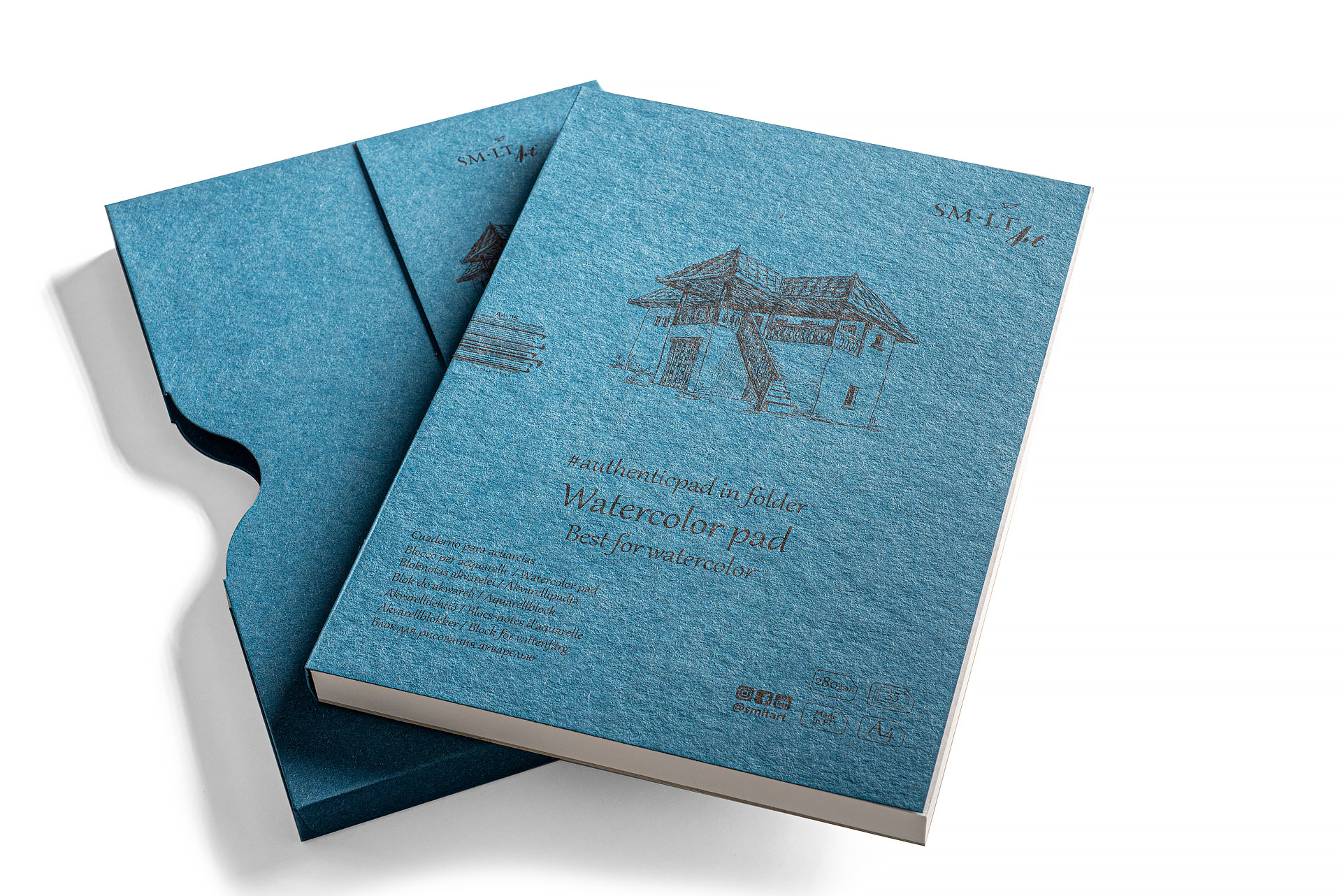 Con papel de acuarela blanco rugoso a base de celulosa. Para todas las técnicas de dibujo con acuarela. Papel interior libre de ácido y con certificación FSC. Con cubierta de cartón de color natural, tapa dura y carpeta, ideal para personalizar.