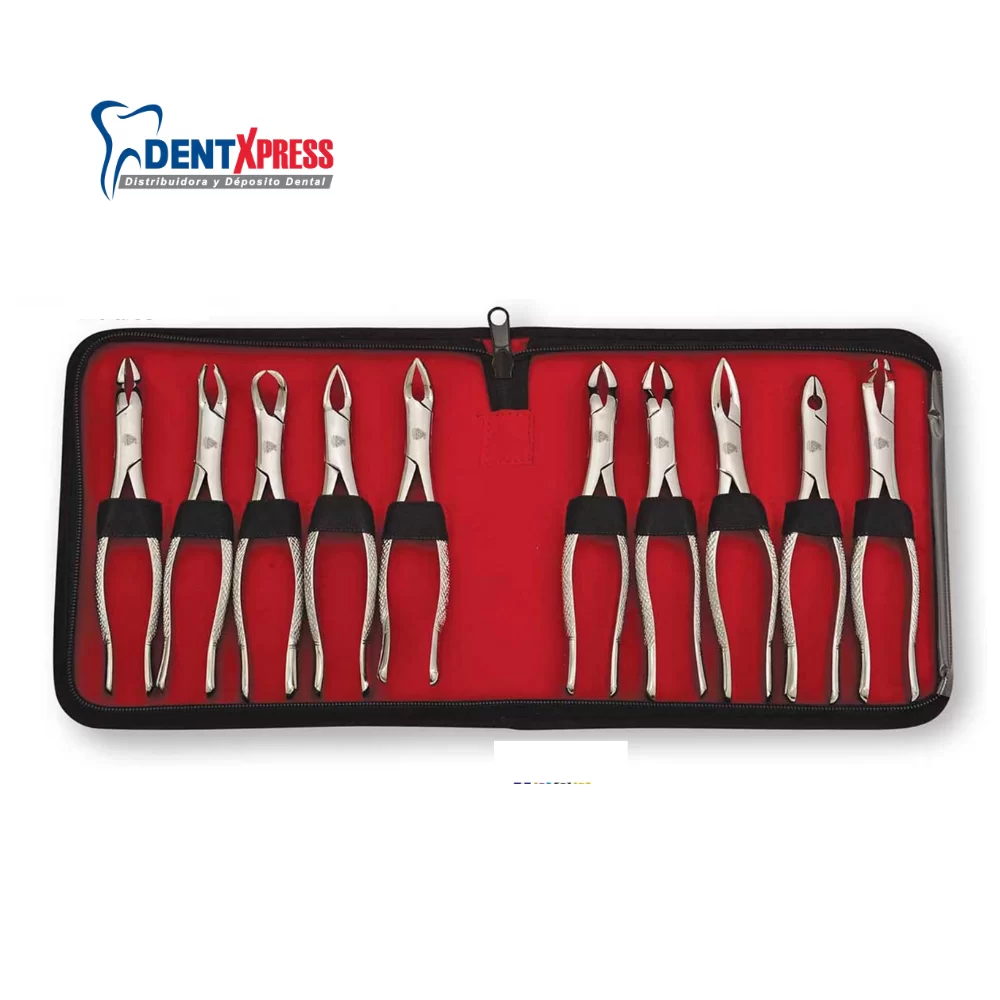 Set de 10 fórceps – Incluye modelos específicos para diferentes piezas dentales.
