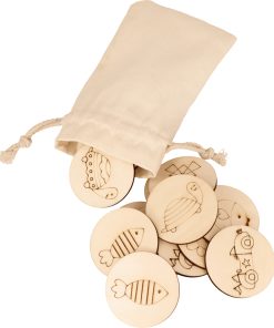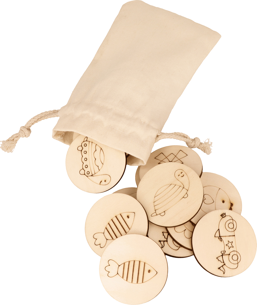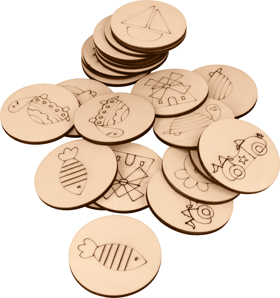 Juego de memoria de fichas circulares con dibujos grabados de caracoles, barcos, peces, molinos…