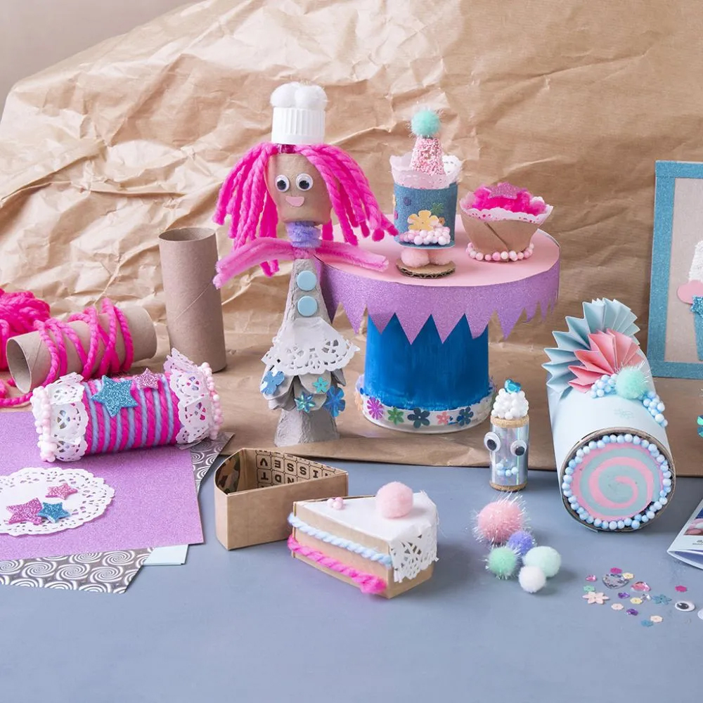 Si quieres reunir a tus amigos para que se diviertan reciclando, este Maxi Mix Creativo es ideal. Viene con materiales creativos con los que tanto los jóvenes como los mayores pueden trabajar y combinar fácilmente con cartón y plástico domésticos. Recoge rollos de papel higiénico y cartones de leche y haz divertidos pasteles de fantasía con pompones y Silk Clay® o adorables figuras con limpiapipas y ojos saltones. Solo necesitas unas tijeras.