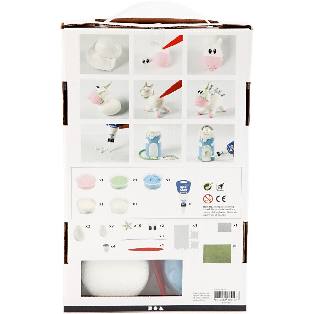 Contiene. Foam Clay y Silk Clay en diferentes colores para unicornio, pasteles y arcoiris. Además limpiapipas metalizados. estrellas con purpurina, goma eva con purpurina.
