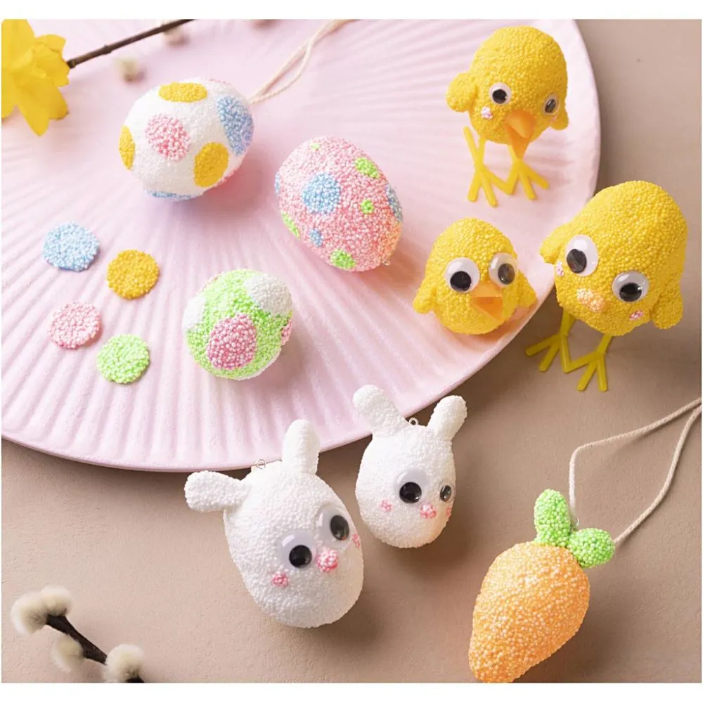 Si quieres dar forma a tus figuras de Pascua, nuestro kit es perfecto. Contiene todo lo que necesitas para empezar. Utiliza Foam Clay® autoendurecible para cubrir los huevos de poliestireno y crear diferentes estilos con los ojos, el pico y las patas suministrados. Puedes modelar las figuras con ideas de tu imaginación, o puedes utilizar las instrucciones del reverso. También puedes encontrar la guía en línea escaneando el código QR de la caja.