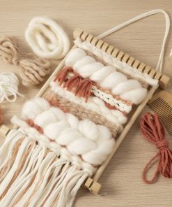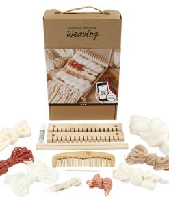 Contenido: Telar (sin montar), pegamento, 6 m de hilo warp, peine, aguja de hilo y hilo en diferentes colores y cualidades – 30 m de hilo en total.