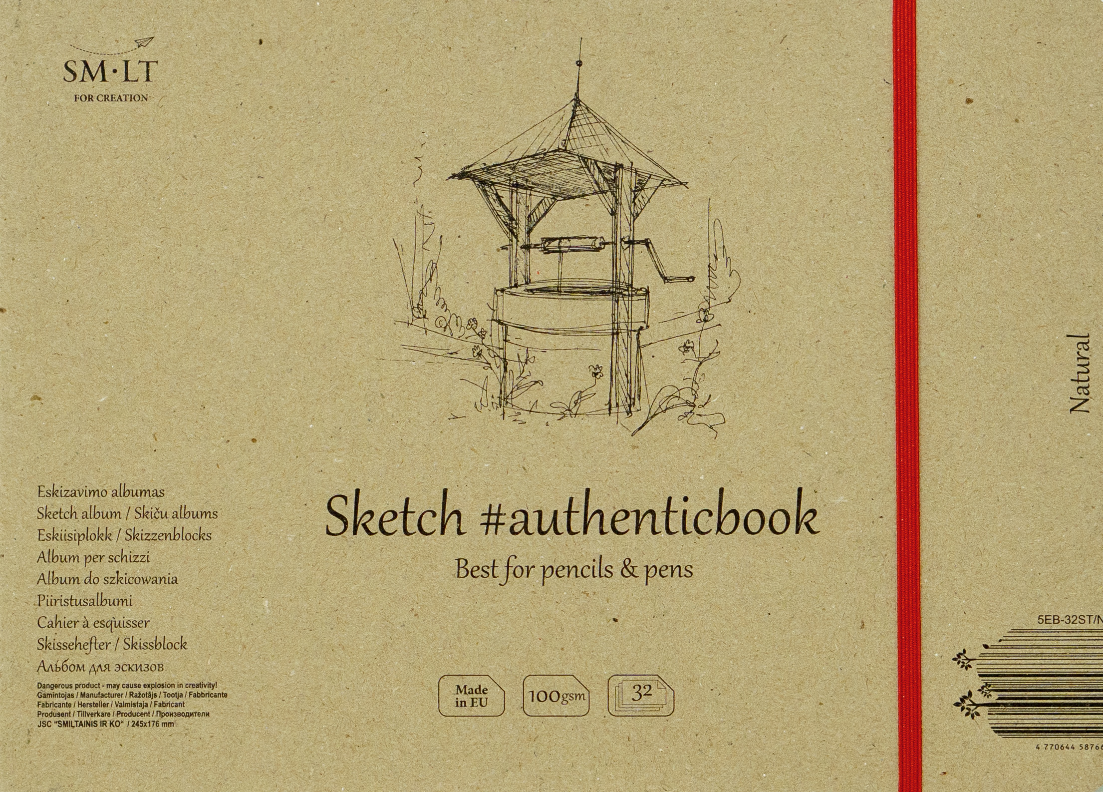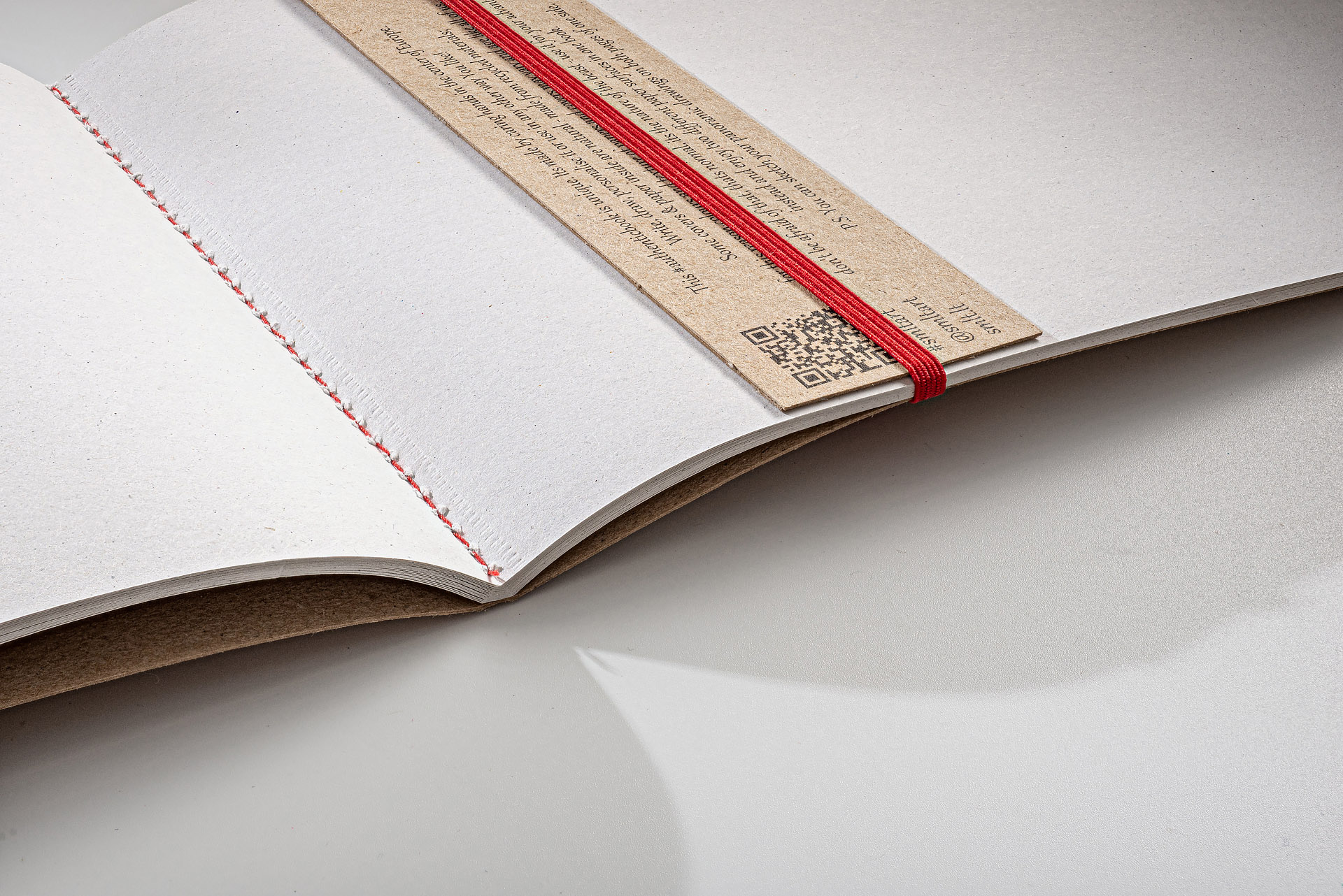 Con papel 100 % reciclado. El papel tiene un tono grisáceo y pequeños puntos irregulares. Ideal para lápices, bolígrafos, tizas y carboncillo. El papel interior cuenta con certificación FSC. Con cubierta y separador de cartón de color natural. El álbum está cosido y permite realizar dibujos panorámicos.