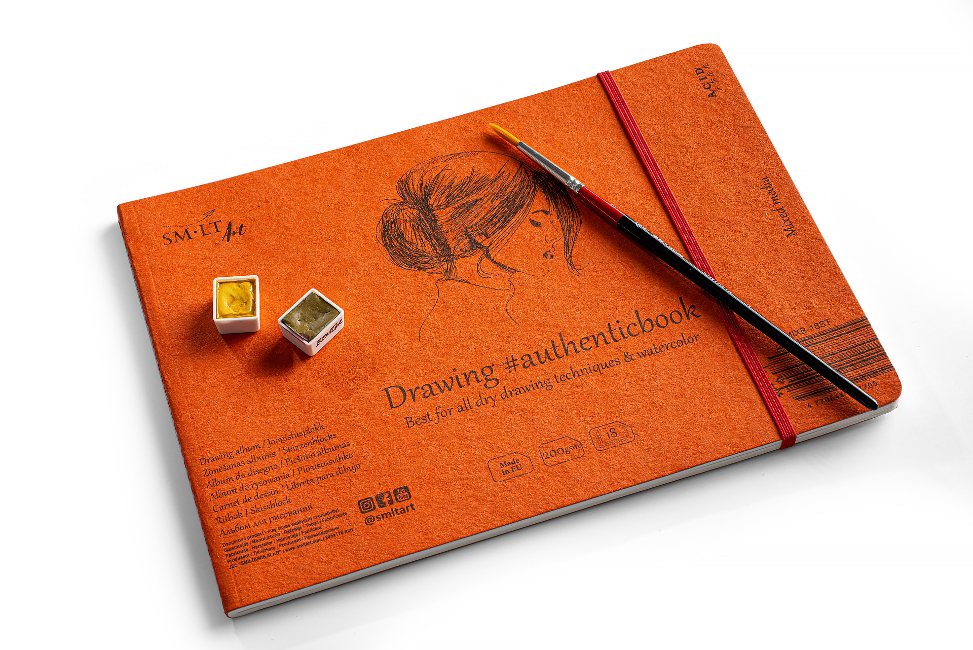 Con papel universal blanco de rugosidad media (prensado en frío). Apto para todas las técnicas de dibujo, tanto en seco como en húmedo. El papel interior es libre de ácido, con pH neutro y certificado FSC. Con cubierta y separador de cartón de color natural. El álbum está cosido y permite realizar dibujos panorámicos.