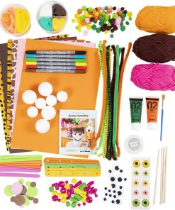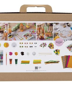 Contenido: pincel, palos de madera, gomaespuma EVA, pompones, papel con dibujos, papel de colores, ojos saltones, ojos de monstruo, limpiapipas, pintura acrílica, rotuladores, palos de espuma EVA, bolas de poliestireno.