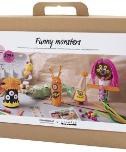 Contenido: pincel, palos de madera, gomaespuma EVA, pompones, papel con dibujos, papel de colores, ojos saltones, ojos de monstruo, limpiapipas, pintura acrílica, rotuladores, palos de espuma EVA, bolas de poliestireno.