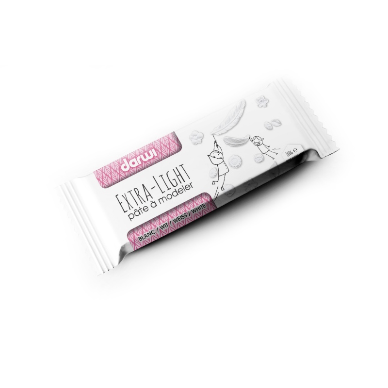 La Darwi Extra-light: siempre en la gama de arcillas autoendurecibles, la extra-light destaca por ser extremadamente ligera. Es tan flexible que se puede utilizar como pasta estructural sobre un lienzo para pintar. Esta arcilla, de color blanco, permite realizar imanes irrompibles, objetos flotantes en el agua (con doble capa de nuestro barniz Darwi), móviles, joyas y colgantes voluminosos pero muy ligeros. La pasta de modelar es adecuada para moldear o modelar delicadamente como, por ejemplo, para tomar impresiones. Una pieza Darwi extraligera pesa 160gr.