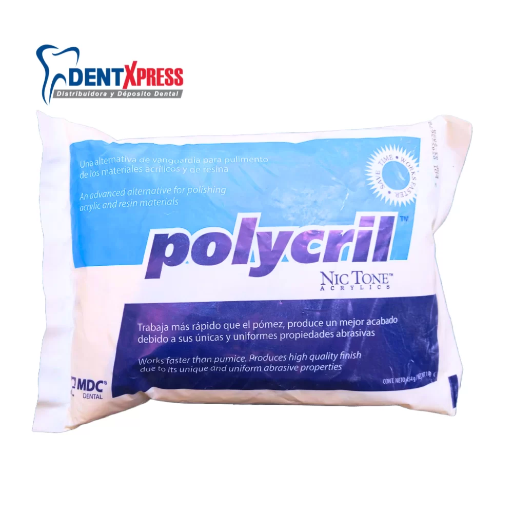 La formula de Polycril contiene un germicida antiséptico, el cual ataca a la mayoría de las bacterias, evitando riesgos de contaminación cruzada cuando las prótesis nuevas y usadas son pulidas en la misma tolva. /Bolsa con 454 g