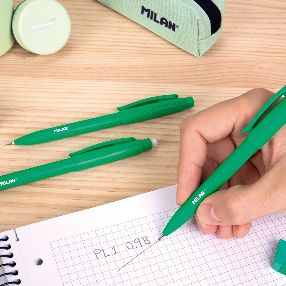 Portaminas con goma eraser&pencil PL1, color verde. Mina de grafito 0,9 mm dureza B, suave. Goma MILAN extra-larga con mecanismo rotatorio. Diseño original creado por el departamento de I+D de MILAN.
