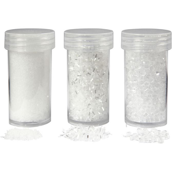 Surtido tres botes con vidrio, purpurina y virutas blancas