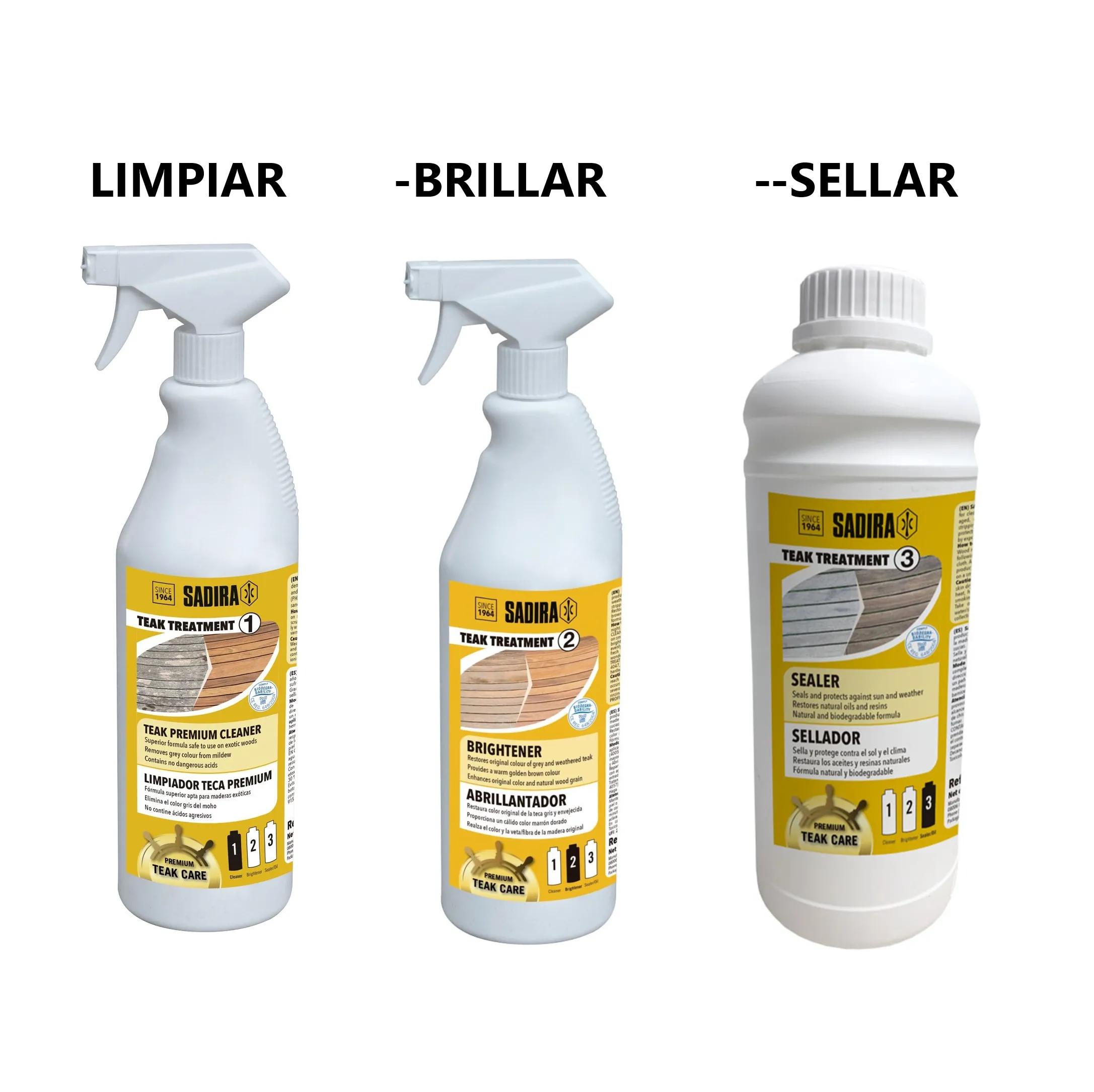 SADIRA TRATAMIENTO TECA consiste en tres productos para la limpieza, renovación, restauración