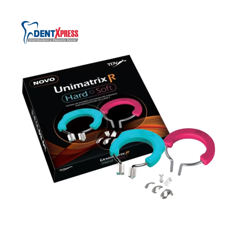 El sistema Unimatrix R es compuesto por matrices seccionales en tres tamaños distintos y dos anillos con refuerzo, Hard y Soft, los cuales promueven mayor fuerza de separación dental, más estabilidad en el procedimiento y longevidad. Los dos anillos poseen protectores de silicona triangulares.